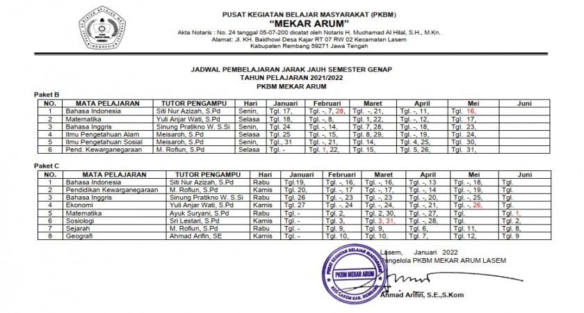 Jadwal Pembelajaran PKBM MEKAR ARUM Tahun Pelajaran 2022/2023